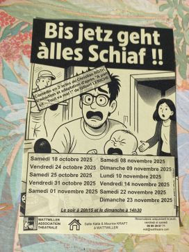 Le théâtre de Wattwiller répète sa nouvelle pièce, Bis jetz geht alles schiaf , adaptée et traduite en alsacien par Christian Roth, de la comédie À part ça, tout va mal , de Gilbert Leriche. La première aura lieu samedi 18 octobre et le bénéfice de la soirée sera offert au conseil de fabrique.